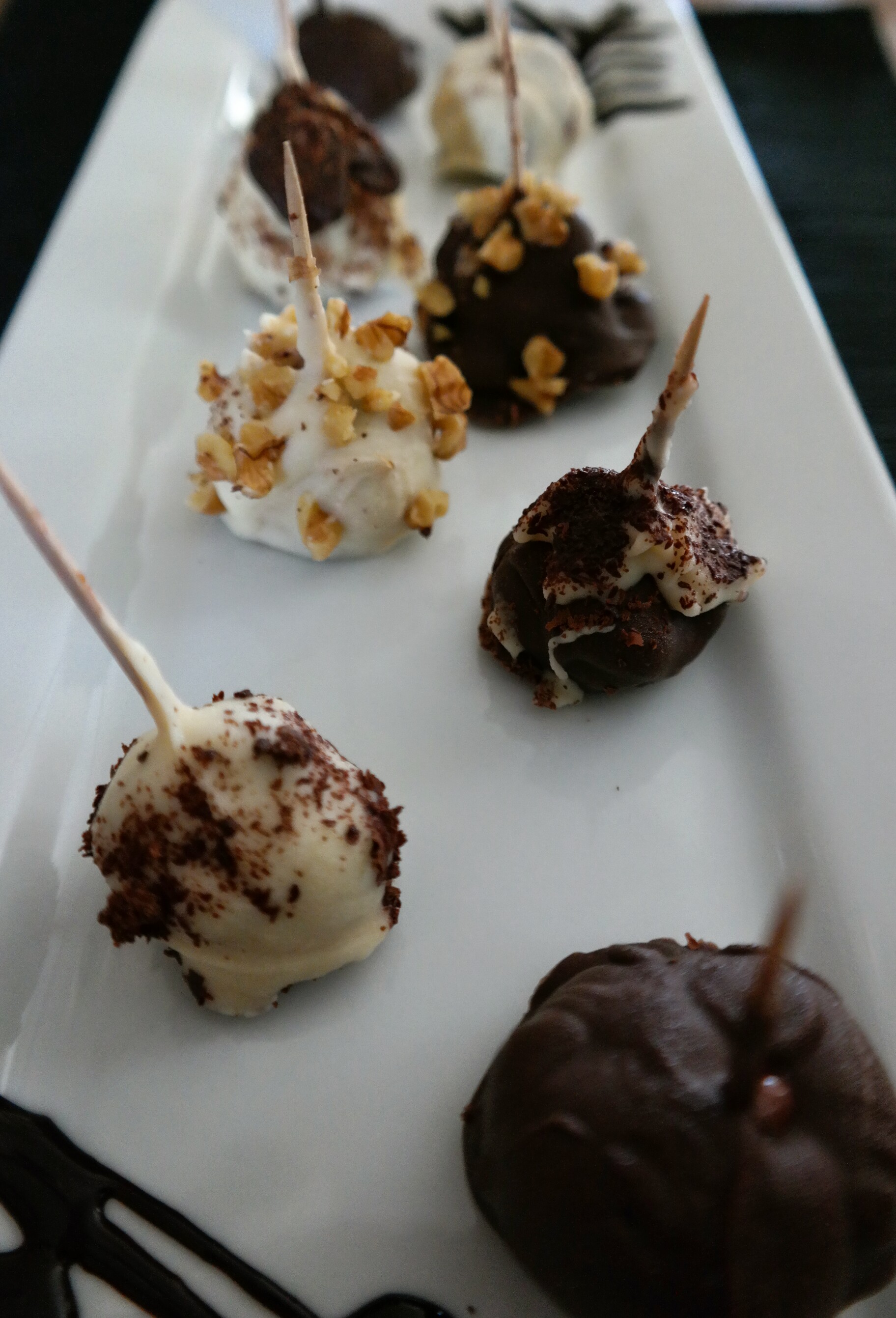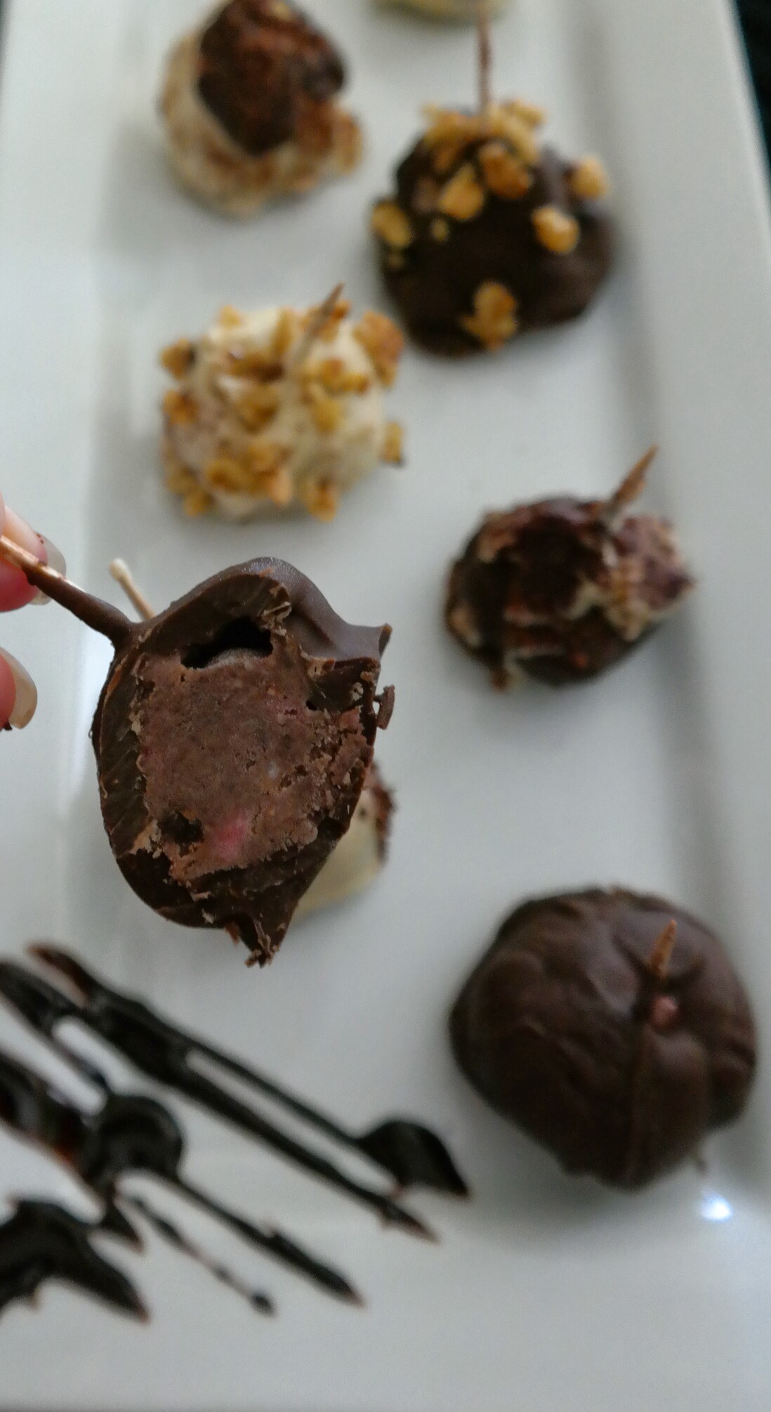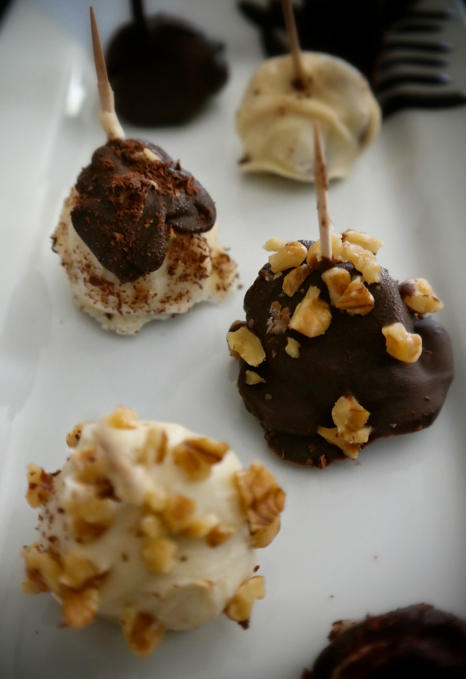 Decide what “toppings” you may want for your ice cream balls. I do walnuts and grated dark chocolate. Crush or grate each one and put into individual prep bowls. In a separate bowl, melt your choice of chocolate (milk, dark, white) or bark. Remove the ice cream balls from the freezer. Use the toothpick to pick up each ball and dip into chocolate