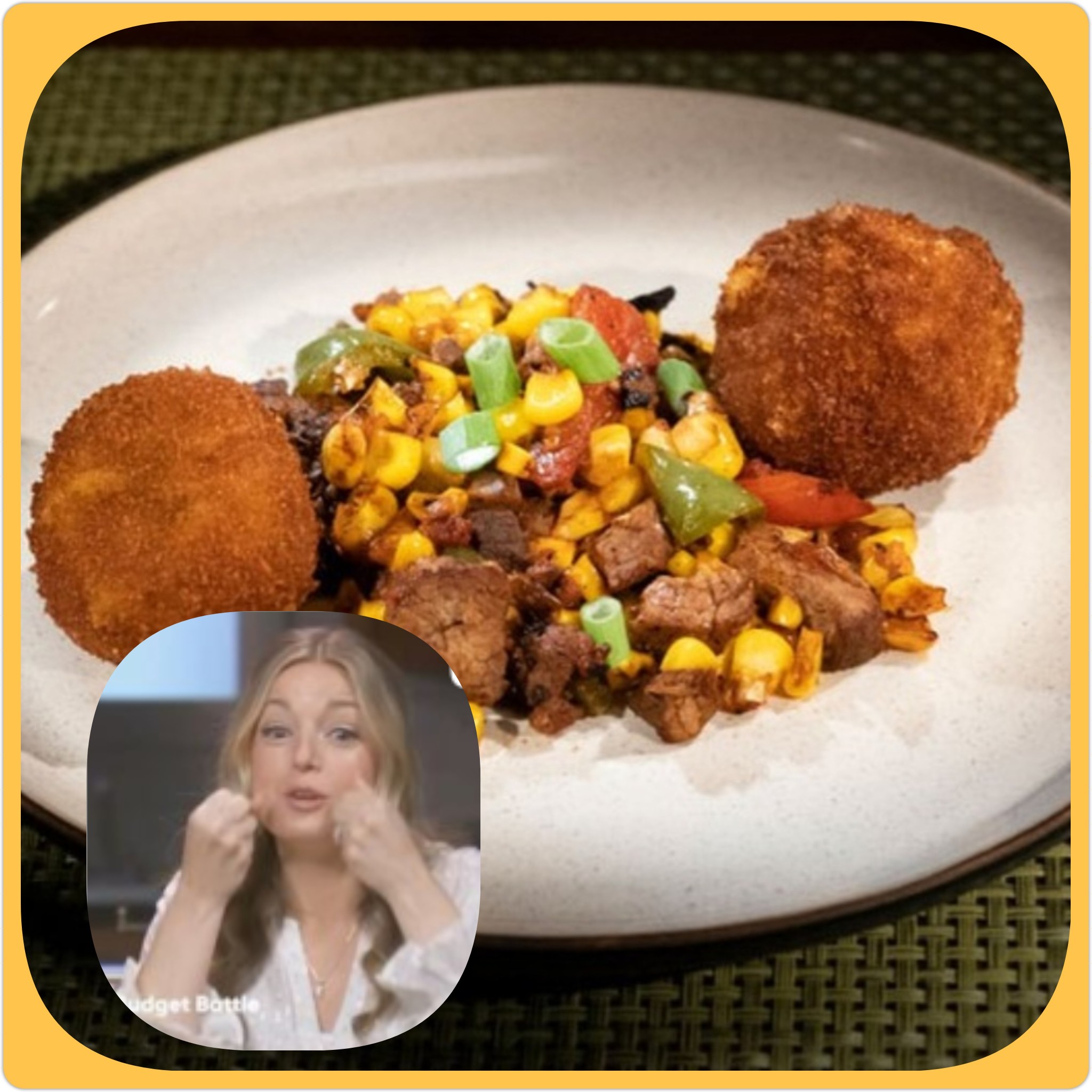In case you haven’t caught the Big Bad Budget Battle, episode two, “Leftover Lessons” yet on Food Network and Discovery Plus, here are my Cornbread Crusted Fried Mac and Cheese Balls with Maque Choux with celebrity chef Damaris Phillips’ expression of, “These are soooo good.”